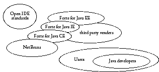 FIGURE 3.4. Different Jini code development interests.A similar situation exists in any large open-source project. In Apache, for example, there are smaller subcommunities focused on the Apache HTTP Server, the Apache Portable Runtime, the Jakarta Project (which includes major efforts such as Tomcat, Struts, and Ant), mod_perl, PHP, TCL, and XML (with subprojects such as Xerces, Xalan, Batik, and Crimson). In addition to communities focused on developing code, other Jini-related groups have formed around interests such as helping beginners learn Jini, Jini in academia, and even Jini marketing and Jini business development. As of spring 2004, there were over 150 projects (although some of them seemed to be no longer active). A characteristic of the Jini community that is not typical of other open-source communities is its elaborate governance mechanisms. Membership is divided into bodies consisting of individuals and companies, called houses. In the General House each person has one vote, and in the Commercial House each company has one vote; and any major decision requires both houses to agree. There is also an appeals board (Technical Oversight Committee) for which the General House, the Commercial House, and Sun Microsystems each selects three members. NetBeansNetBeans is a modular, standards-based integrated development environment (IDE) that software developers use to create and modify applications written in Java. An integrated development environment is a software bundle consisting of a text editor (for creating and modifying software source code), code-building automation tools (for combining source code components into a whole application), a compiler (for preparing source code for machine execution), a code execution platform (an interpreter or runtime environment to run the code), and a debugger (for locating and repairing coding errors). NetBeans supports a wide range of features, from JSP development and debugging to integrated CVS support and beyond. All of these pieces of functionality are implemented in the form of modules that plug into the NetBeans core. As an open-source project, the basic version of NetBeans is available free to anyone wishing to use it. Sun's main interest in NetBeans is to bring developers to the Java platform and make them successful. Figure 3.5 diagrams the various communities involved with the NetBeans project circa 2002. In addition to those directly involved with developing the NetBeans source code, there are three additional groups at Sun working on the various editions of Forte for Java: Community Edition (CE), Internet Edition (IE), and Enterprise Edition (EE). ( Note : In late 2003, the Forte for Java product line was renamed as Sun Java Studio.) The last two editions are for-sale products that include additional proprietary modules. There are also various third-party companies developing NetBeans modules that are also for sale.