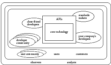 FIGURE 3.3. Communities built around common interests.Each of these communities has its own special interests; for example, some communities connected to Linux might include system administrators concerned with installing and configuring the Linux operating system on various types of computers. Another group of people might be concerned with business productivity tools (such as word processors, spreadsheets, and presentation tools) that are available for Linux--their focus is on what tools exist and how to use them. A third community might form around computer games available for Linux, with a subcommunity around a specific game such as Quake--this group would focus on exchanging tips, rumors of new games, and finding opponents to play with. Each community will flourish or wither depending on how well its interests are met by the community resources. For example a community of newbies asking basic questions about how to use a piece of software will succeed only if more experienced users who can answer those questions are also part of the community. In the course of a successful open-source project, different communities will come and go. New ones will spring up, grow, and possibly become dormant or die. As long as there are always some thriving communities, the larger open-source project can be considered alive and well. Note that death of a community does not equal failure. Consider a community that arises to develop a new standard. After the standard it developed has been accepted by the larger Internet community, the community has achieved its purpose and is no longer necessary. If future revisions to the standard are called for, the community might be resurrected. Examples of Multiple CommunitiesTo make this more concrete, let's look in depth at some of the different communities within two Sun-sponsored projects, Jini and NetBeans. JiniJini technology is a simple distributed computing model based on the Java programming language developed by Sun. Among other things, it was intended as a model for services--small bits of functionality--to discover each other dynamically and create a network of interoperating program parts. These services could be housed within devices--physically separate computing platforms as far as Jini is concerned. For Jini to succeed, it was clear that the underlying Jini protocols and infrastructure would need to become pervasive, and to accomplish that would require a strong community of participants and partners. Moreover, Sun did not have the expertise to define Jini services in areas such as printing, digital photography, storage, white goods, and the many other potential markets for products that would benefit from being network enabled. Within the Jini Community that has developed since the core code was released, there are many separate communities focused on creating Jini services in different application areas, as shown in Figure 3.4. A small number of developers care about further developing the core Jini code. Others care only about areas such as printing or enterprise applications or building networked appliances that use Jini to connect to services. People working in one application area often have little in common with those working in another area. For example, those people working on creating services for appliances in the home have a very different set of concerns from those using Jini to connect legacy enterprise applications.
